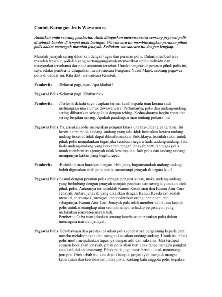 Wawancara itu membincangkan peranan pihak polis dalam mencegah masalah. TEKNIK PENULISAN KARANGAN BERFORMAT WAWANCARA Pengenalan Karangan jenis wawancara dan perbualan. Kesan Kenaikan Harga Minyak.